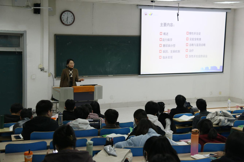 以内科为起点,迈出医学第一步。万磊以“11月14日世界糖尿病日”为引开讲,用风趣易懂的方式为大家科普糖尿病概念、全球及全国糖尿病患者占比、糖尿病分型、病因与发病机制、糖尿病并发症、检查诊断与治疗等知识。刘云霞讲解低血糖症的自我识别、易发人群、发作状况,并科普预防方法和应对措施。孙文昕结合真实临床案例通过为同学们介绍发热分期、降温措施、药物选择等分享各类发热情况及处理方法。同学们结合自己感兴趣的问题与老师们展开现场答疑互动。