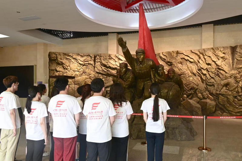7月11日,队伍首先来到德州市乐陵市,参观冀鲁边区革命纪念馆。同学们怀着崇敬的心情,仔细聆听讲解,回望渤海老区和渤海走廊的军民以坚韧不拔的意志和英勇无畏的精神谱写的中国革命壮丽篇章。在德州市宁津县,同学们了解了渤海军区教导旅守卫家园、战旗西指、屯垦戍边的历史,体会到战士们用青春和生命铸就的“大义大爱、无私奉献、听党指挥、永葆信念”教导旅精神品质。队伍还去往地处冀鲁边区东部,传承着“不屈不挠、艰苦奋斗、顾全大局、无私奉献”老渤海精神的滨州市滨城区,瞻仰了庄严肃穆的“渤海魂”纪念雕塑。它巍峨挺立,仿佛在诉说着那段烽火连天的岁月,承载着历史的重量,让人不禁肃然起敬。同学们站在雕塑前,仿佛能听到革命先辈们慷慨激昂的誓言,感受到他们为了民族独立和人民解放而英勇奋斗的决心。此次对冀鲁边区红色精神的探索之旅,使同学们深刻领悟到革命精神的内涵,更加坚定了为实现中华民族伟大复兴的中国梦而努力奋斗的决心。