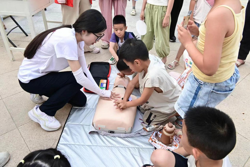 7月12日,队伍来到宁津县宁城街道正阳社区演示并讲解了心肺复苏和海姆立克急救法的要点以及AED除颤仪的使用,团队成员们以生动形象的讲解方式,将复杂的心肺复苏和海姆立克急救法知识化繁为简,利用模拟人进行实际操作演示,边做边讲,确保每一位在场的居民都能掌握正确的急救技能。在介绍心肺复苏时,团队成员们更是别出心裁地通过现场互动的方式,让小朋友们也积极参与进来,同时巧妙地融入了渤海老区和渤海走廊的红色文化元素,通过展示历史图片、播放纪录片等形式,让居民们在了解急救知识的同时也能感受到这片土地所承载的厚重历史和革命精神,不仅丰富了活动内容,也进一步激发了大家的爱国热情和社会责任感。