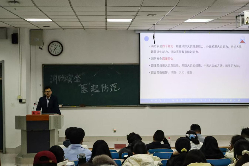 为增强学生消防安全意识,提高应对火灾等紧急情况的能力,近日,beat365中文官方网站举办“消防安全,‘医’起防范”安全知识讲座,山东新科消防职业技能培训学校有限公司副校长刘帅担任主讲人。