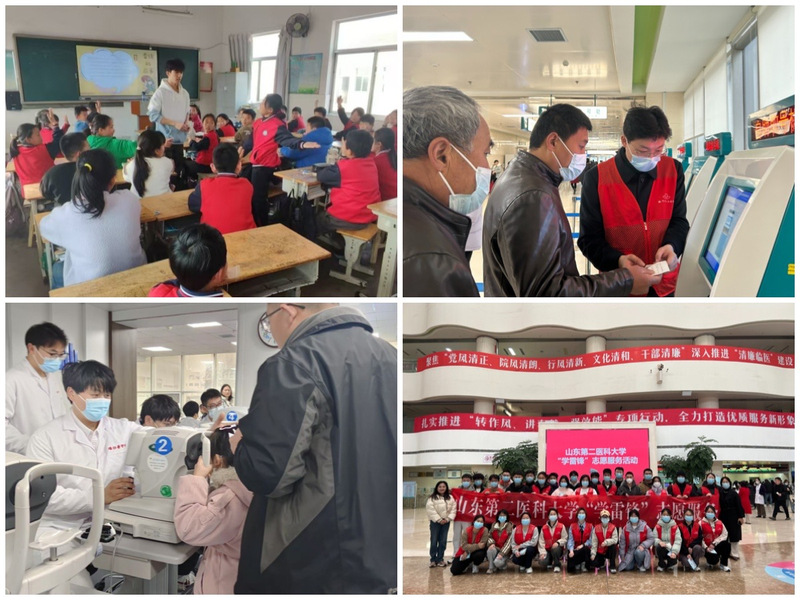 医+服务,志愿服务践行医者初心。学院联合各附属教学医院,组织见实习学生在临床一线开展医学生志愿服务活动。学生志愿者走进医院,穿梭于门诊大厅导医导诊,用青春的热情驱散病患的焦虑;走进眼科中心,手持仪器为患者进行视力检查和眼压检测,用细致的操作守护每一寸光明;走进社区广场,搭起义诊台为居民测量血压、血糖,用耐心的解答科普健康知识。
