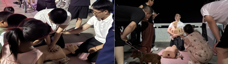 “按压要稳、准,深度必须达5厘米!”为进一步普及应急救护知识,强化村民应急处置能力及自救互救意识,7月16日,阳谷县南湖广场上,山东第二医科大学附属医院“心跳行动”服务队成员丁高峰带领“汇爱”志愿服务队积极开展急救知识普及活动,通过模拟假人进行实操培训发放印有方言注解的急救手册、在广场大屏循环播放张军桥医生的急救教学视频,为村民们普及心肺复苏术、海姆立克急救法等相关知识。志愿服务队同步推进健康档案建立工作,志愿者们俯身老人做调查问卷、蹲坐与村民聊习惯,将问卷与数据转化为守护健康的“第一手资料”。“既能学急救、查健康,又能知情、晓政策,这样的服务真是送到了咱心坎里!参加活动的村民纷纷点赞。